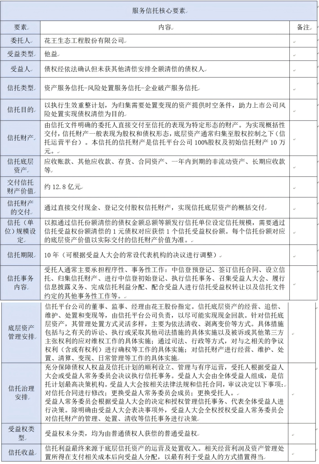 保障和维护好债权人利益,是上市公司破产重整的核心目标之一,破产服务信托当然应服务好这种安排,2024年上市公司破产服务信托在此方面比以往做的更具特点。花王重整计划规定,信托计划存续期限为10年,如存续期限满5年后以信托清偿债权仍未清偿完毕,将以届时仍未清偿完毕的债权金额为本金、按同期全国银行间同业拆借中心公布的五年期贷款市场报价利率(LPR)计算利息,直至本息清偿完毕为止;清偿方式为利随本清,即每次清偿时同时偿还部分本金及其对应的利息。如信托计划存续期限届满、信托计划完成终止清算后,以信托清偿债权本金及利息(如有)仍未清偿完毕的,苏州益波元企业管理合伙企业(有限合伙)将对未清偿完毕的债权进行差额补足、以现金方式兜底清偿。上述规定,可以保障债权人利益的确定实现,从一定程度上实现了展期留债清偿的执行效果。目前有观点对信托份额清偿债权后债权利益最终实现的确定性提出了质疑,花王股份案件的该等安排,正是对破产服务信托应用效果薄弱环节的加固。