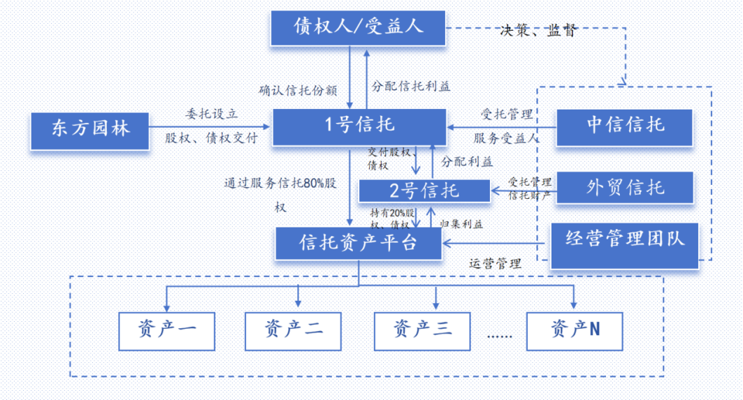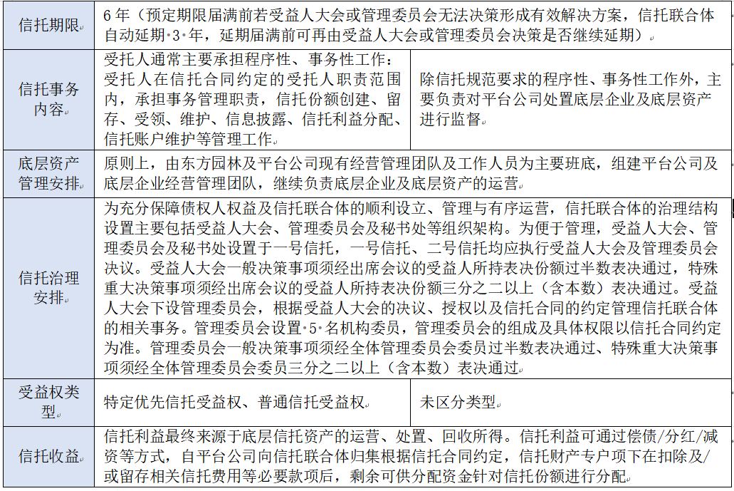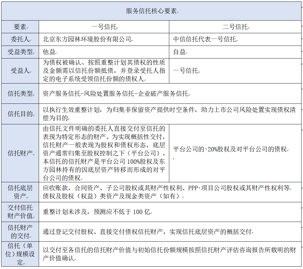 东方园林案件与前连个案件也有不同,有财产担保债权部分无法及时实现处置的特定资产也置入了服务信托,并对应设定了特定优先信托受益权。该等安排,避免了特定抵押物快速变现损失,有利于维护相应债权人利益。