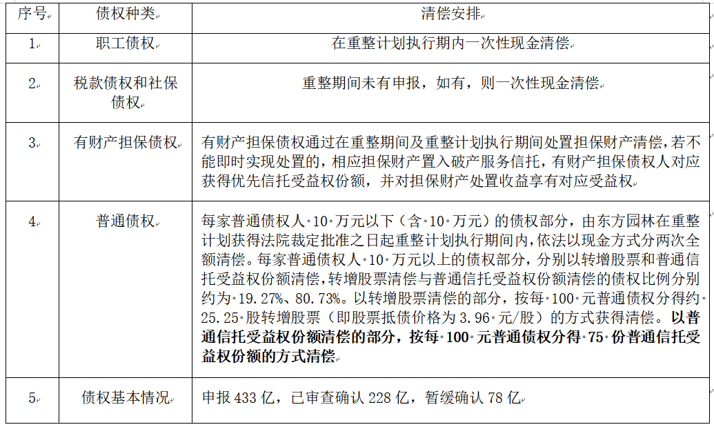 2024年5月9日,北京一中院决定对东方园林启动预重整。2024年1月22日,北京一中院裁定受理债权人对东方园林提起的重整申请,并指定北京东方园林环境股份有限公司清算组担任管理人。2024年12月23日,法院裁定批准重整计划,2024年12月30日,北京一中院裁定确认重整计划执行完毕。