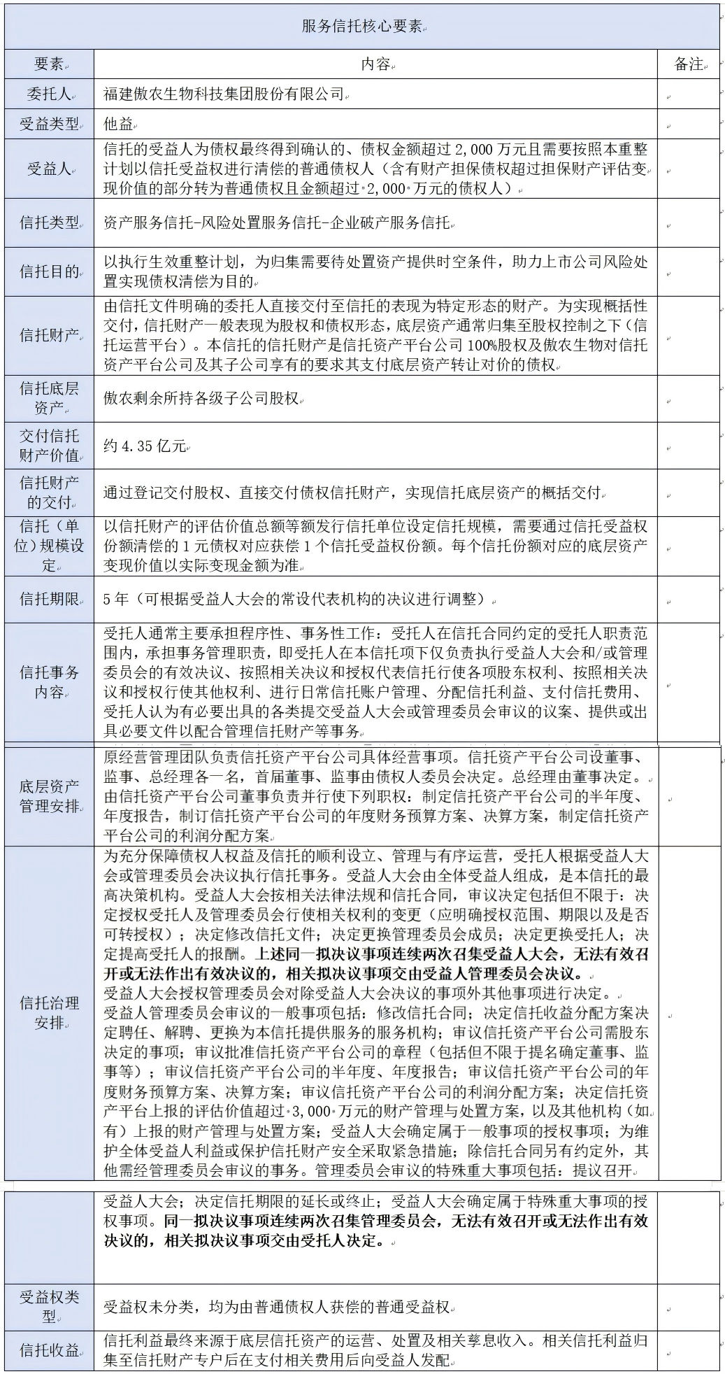 特别说明:中利集团破产服务信托并未在中利集团的重整计划中详细描述,只是作为协调重整案件瑞和网 ,其子公司腾晖光伏通过设立企业破产服务信托的方式,并将相应的信托受益权份额作为中利集团及协调审理下级公司的重整计划规定的偿债安排以外的额外偿债资源分配给包括中利集团债权人在内的全体债权人。在中利集团协调审理案件范围内,偿债资源同一,偿债条件一致,受偿债权人被无差别对待。基于此,笔者将此案件也视为上市公司破产服务信托的应用。