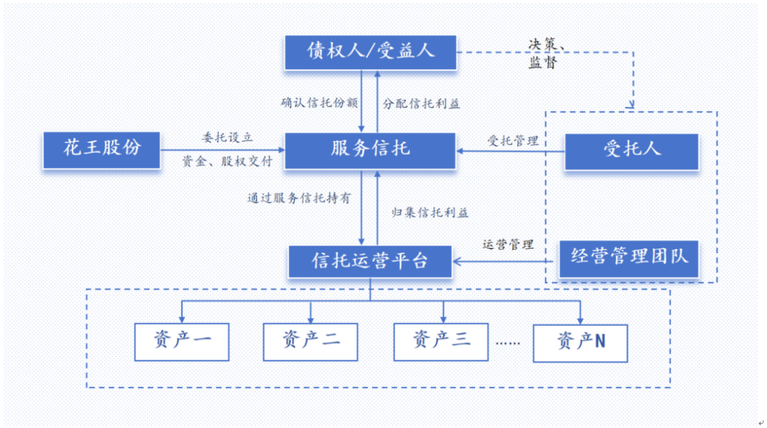 花王股份破产重整案件中破产服务信托在承担了资产整合改善资产质量及偿债工具角色。服务信托一方面实现了上市公司低效资产的打包置出,改善了上市公司的资产质量,为上市公司未来的高效高质量发展创造了条件;另一方面,通过信托份额向债权人的确认分配,实现了部分债权的清偿。
