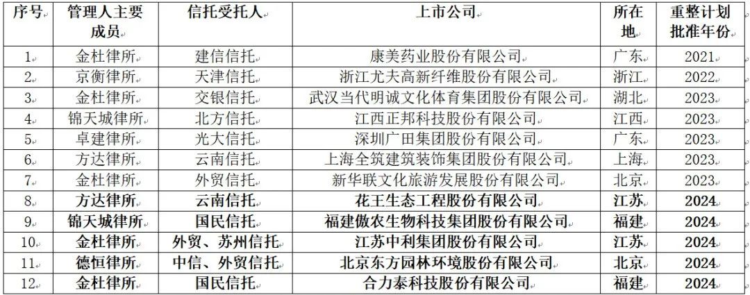 根据公开信息,笔者整理了截止至2024年12月31日经批准的上市公司重整计划,现将上市公司在破产重整中应用破产服务信托的全量数据列表如下。