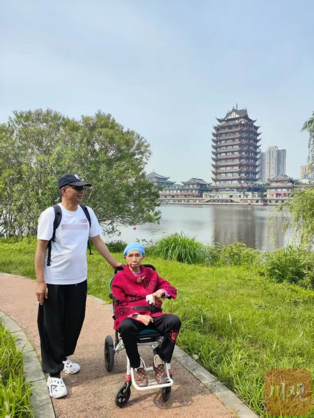 柴万斌背着妈妈旅游。5月1日当天,一家人到黄龙溪旅游。考虑到一些路段无法推轮椅,柴万斌就带上了当初背儿子的背带。一路上,他和三姐两人换着背。考虑到平常主要是三姐照顾妈妈,加之三姐比自己年长,自己是当天背妈妈的主力。“这条花背袋是我儿子外婆亲手做的,母亲用它背过孙子孙女儿。如今,当母亲走不动了,我用来背着她去旅行。”其实,背带并不是柴万斌带母亲出行的首选辅助交通工具,他们还准备有轮椅。“只有不好走的地方,才用得上背带。”柴万斌说,他用背带背着母亲还看过西昌的邛海、眉山的水街、东坡岛等风景,有时是抱着母亲,只有这一次被人拍了,还发了抖音和视频号,让他走红网络。