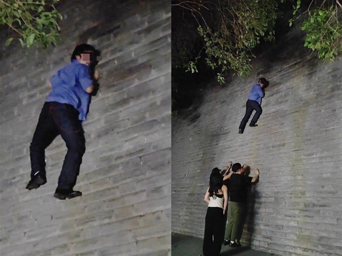 男子攀爬城墙被围观