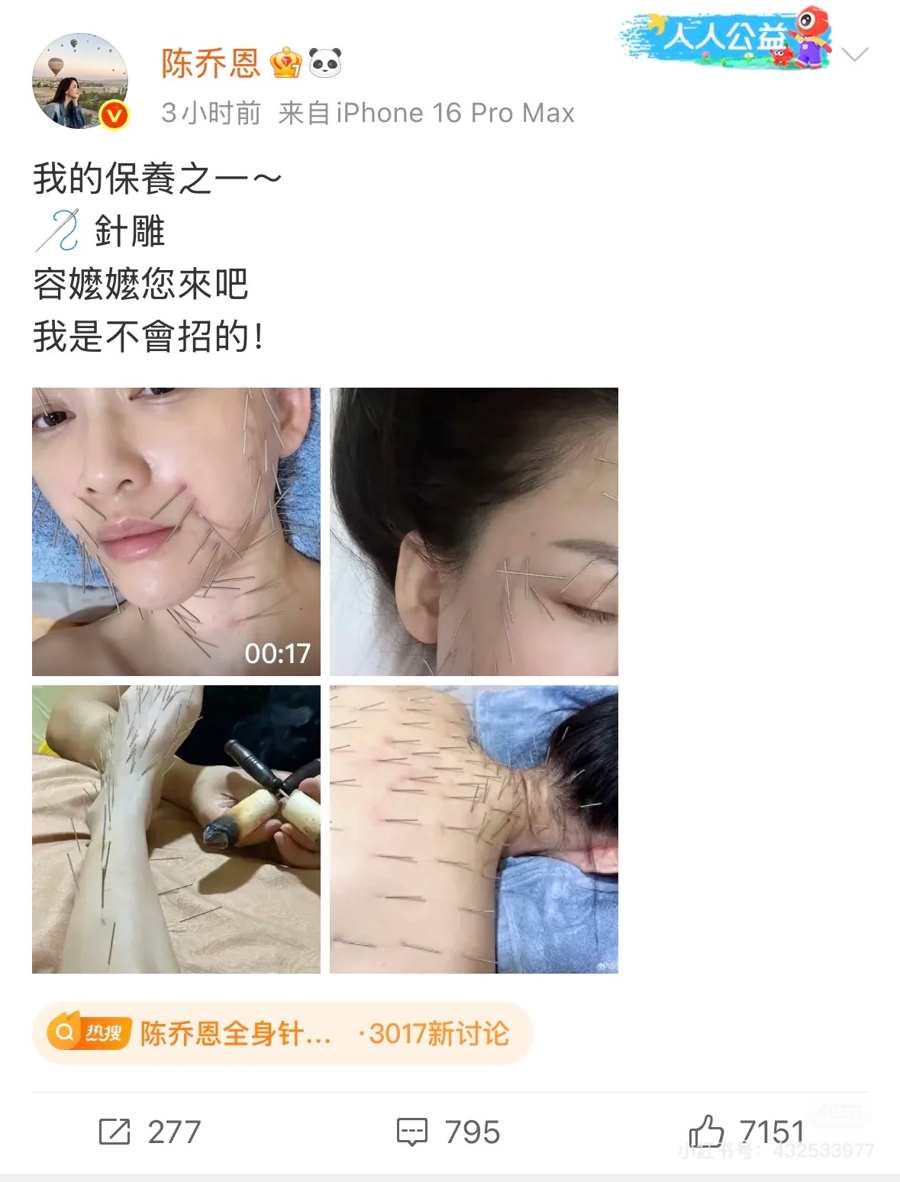 近日女星陈乔恩同款“针雕”美容走红“小红书”等社交媒体,引得不少年轻女性好奇。照片上,女星满脸扎满针灸,据说这种“针雕”项目可刺激胶原蛋白再生、加强机体自我调节功能。