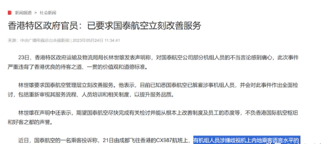 从网友公开的视频中,很难想象这是一个经过专业航空公司培训出来的空姐,而随着这件事的热度越来越高,国泰也是迅速发布了道歉声明。