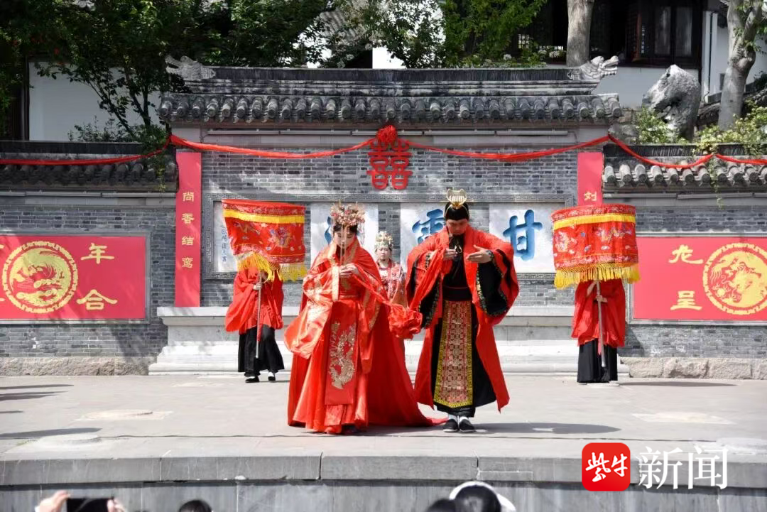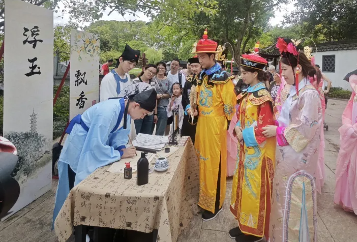 “刘备招亲”实景演出,时间:10月1日至10月6日,每日14:00开始(雨天停演);地点:甘露流芳广场。实景还原“刘备迎娶孙尚香”的经典场景,演员身着古装演绎礼仪、对话,游客还能现场参与互动,比如递喜糖、送祝福,亲身感受三国时期的浪漫与厚重。